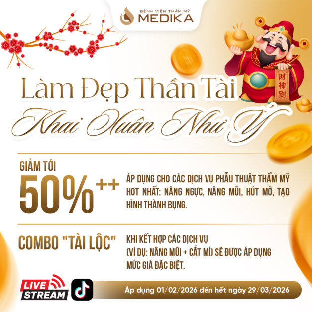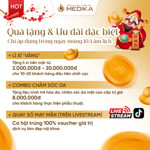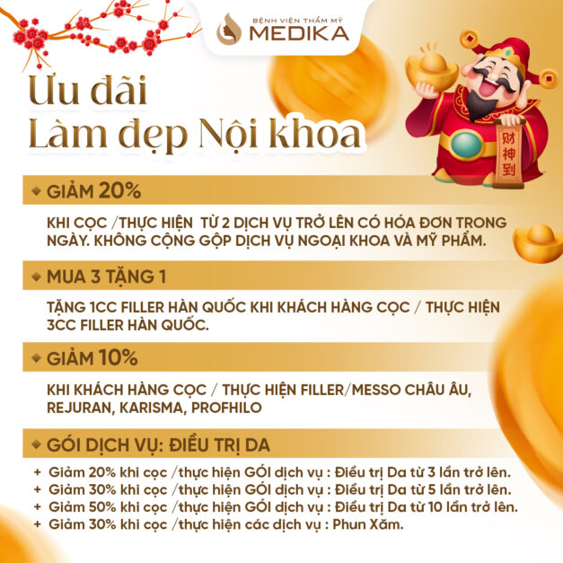 Tung deal Lì Xì mừng ngày Vía Thần Tài giảm tới 50% cho tất cả các dịch vụ làm đẹp tại BVTM MEDIKA - Nhận ngay Combo "Tài Lộc" - Giá đặc biệt khi kết hợp từ 2 dịch vụ.