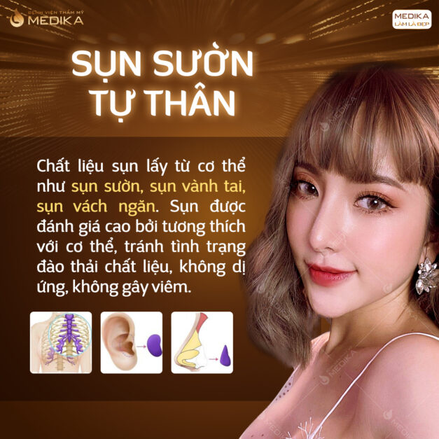 Sụn tự thân: là loại sụn được lấy trên chính cơ thể khách hàng (sụn tai, sụn sườn, sụn vách ngăn…), có độ tương thích cao và kết quả duy trì lâu dài.